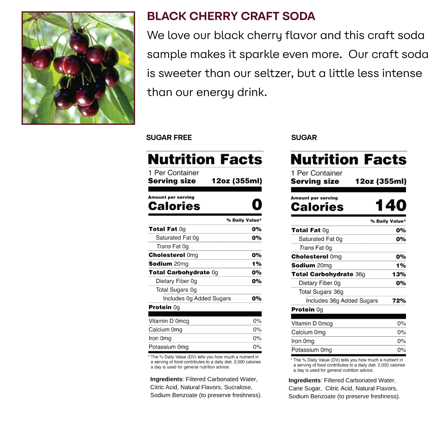 We love our black cherry flavor and this craft soda sample makes it sparkle even more. Our craft soda is sweeter than our seltzer, but a little less intense than our energy drink.