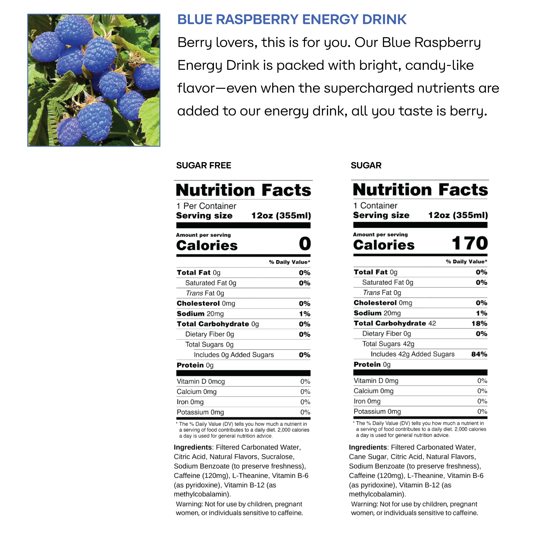 Berry lovers, this is for you. Our Blue Raspberry Energy Drink is packed with bright, candy-like flavor—even when the supercharged nutrients are added to our energy drink, all you taste is berry.