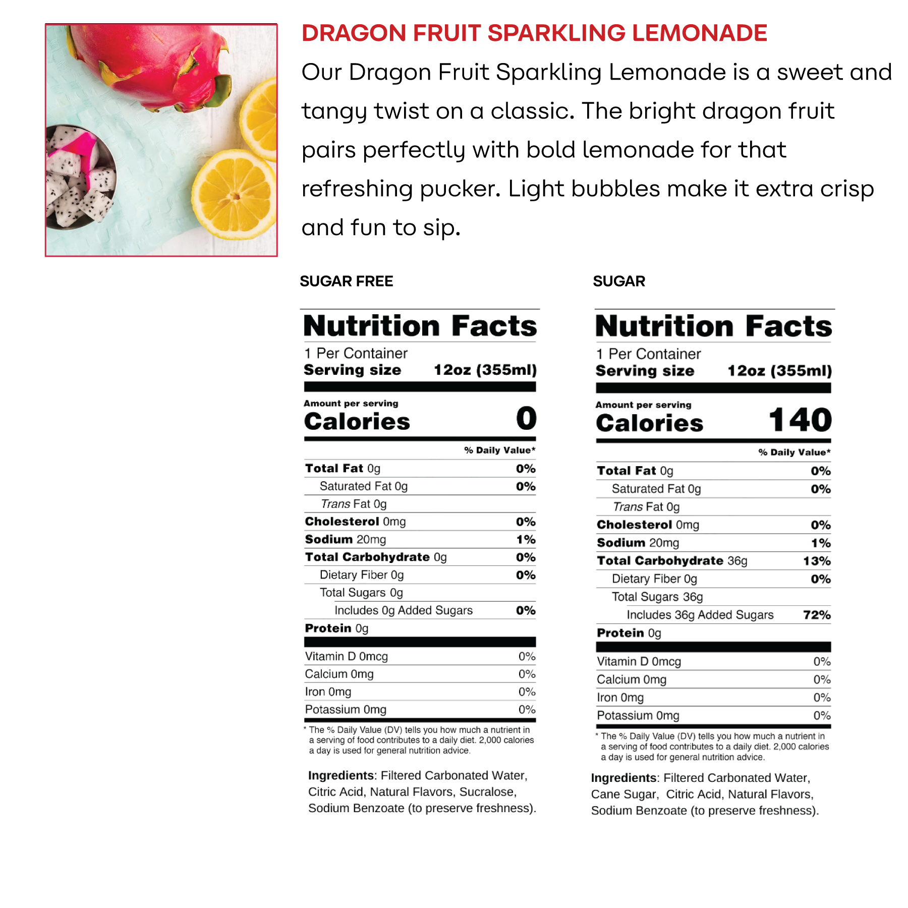 Our Dragon Fruit Sparkling Lemonade is a sweet and tangy twist on a classic. The bright dragon fruit pairs perfectly with bold lemonade for that refreshing pucker. Light bubbles make it extra crisp and fun to sip.
