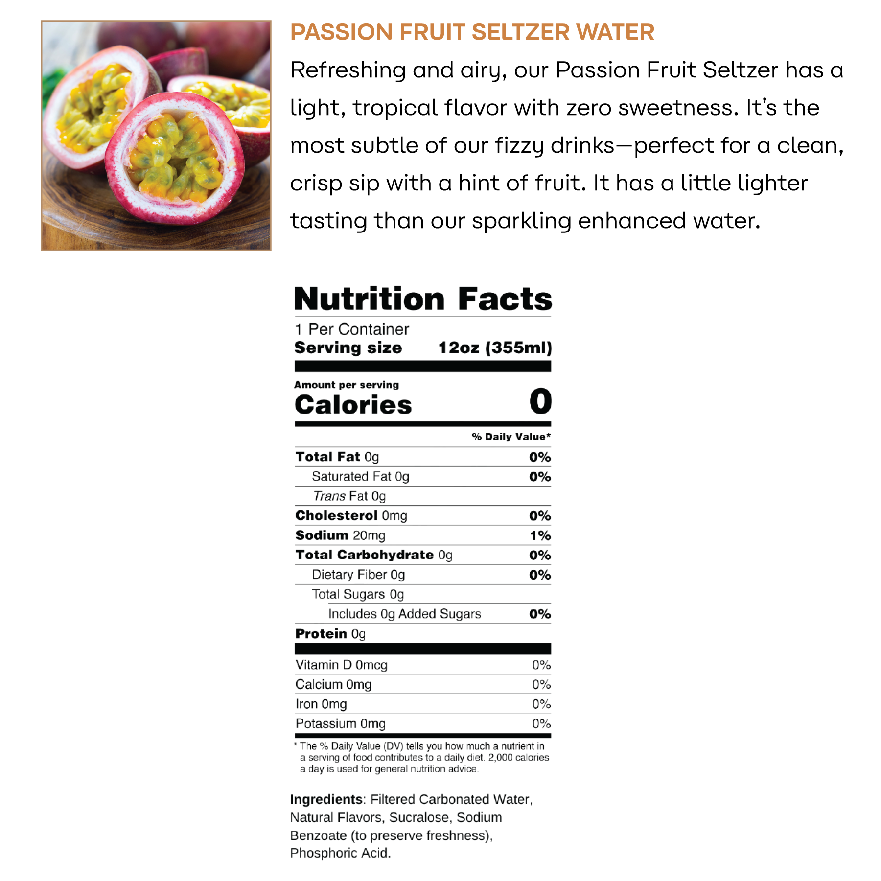 Refreshing and airy, our Passion Fruit Seltzer has a light, tropical flavor with zero sweetness. It’s the most subtle of our fizzy drinks—perfect for a clean, crisp sip with a hint of fruit. It has a little lighter tasting than our sparkling enhanced water.