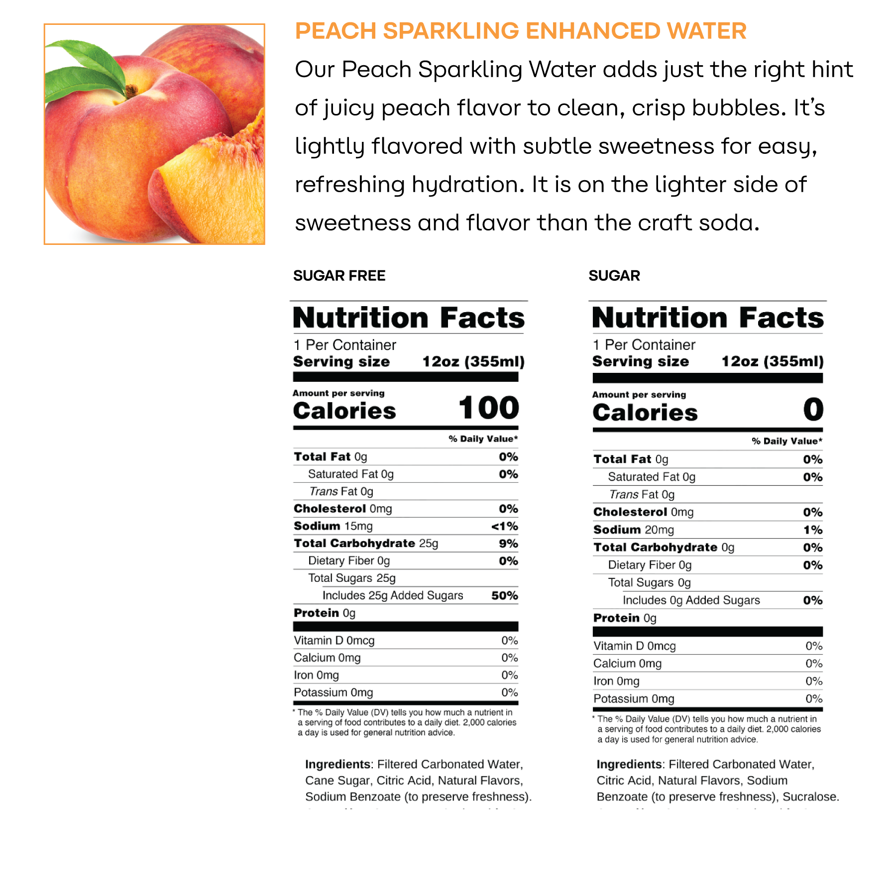 Our Peach Sparkling Water adds just the right hint of juicy peach flavor to clean, crisp bubbles. It’s lightly flavored with subtle sweetness for easy, refreshing hydration. It is on the lighter side of sweetness and flavor than the craft soda.