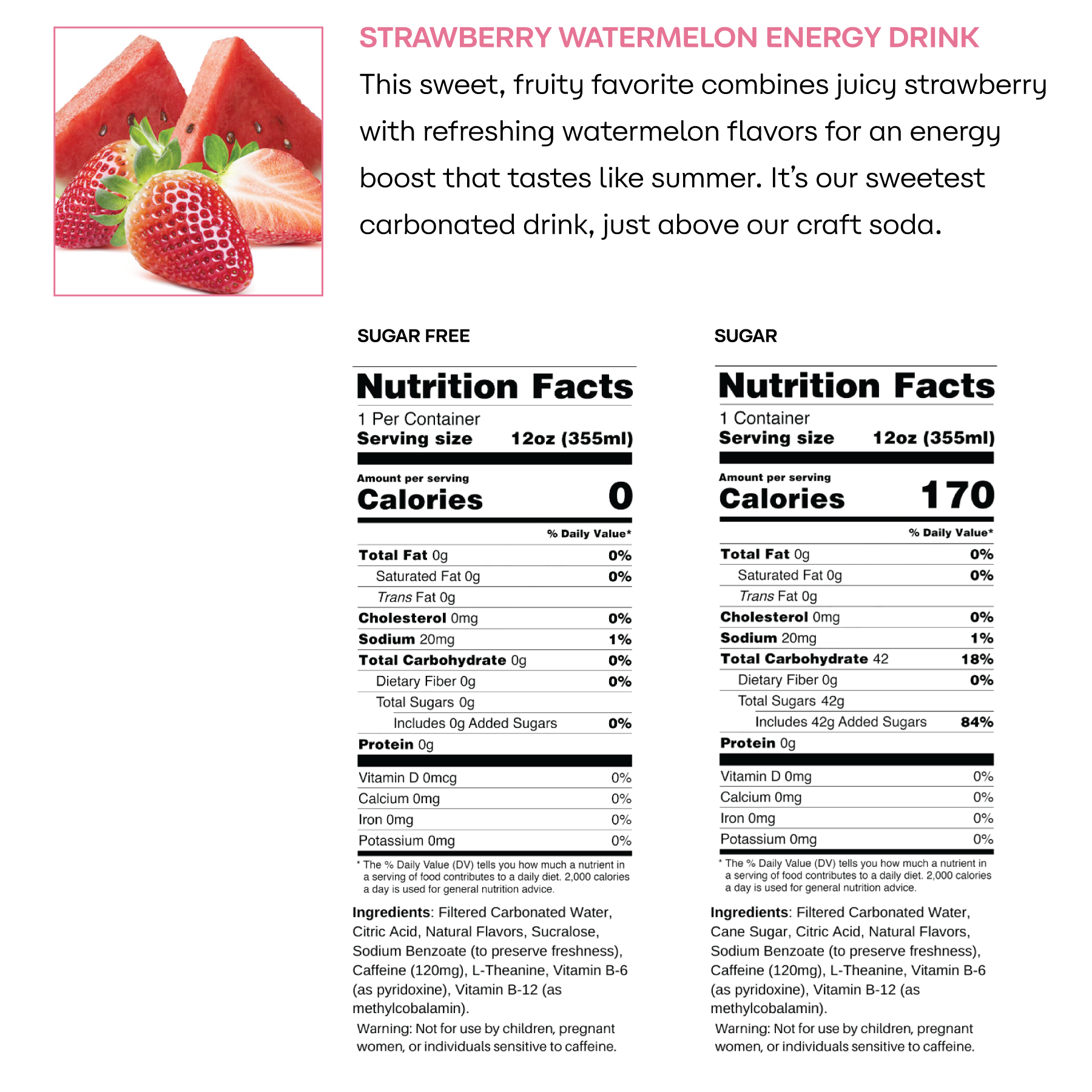 This sweet, fruity favorite combines juicy strawberry with refreshing watermelon for an energy boost that tastes like summer. It’s our sweetest carbonated drink, just above our craft soda.